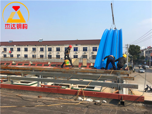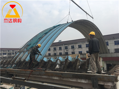 • 安裝階段:拱形屋頂瓦由杰達無梁拱設備現場壓型成型,逐榀吊裝拼接,完成后再依次安裝山墻瓦及過道屋面板。