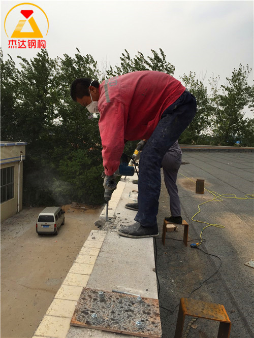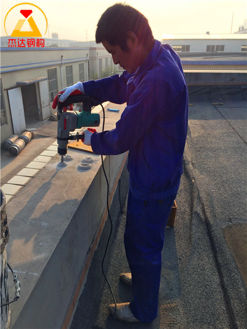 穿墻預(yù)埋件通常沿墻體頂端均勻間隔布置,配合膨脹螺栓或化學(xué)螺栓加固固定。此工藝主要解決在原有建筑沒有預(yù)留預(yù)埋件情況下的施工需求,常見位置包括水槽邊或圈梁部位。以下圖片來自江蘇杰達(dá)鋼結(jié)構(gòu)工程有限公司在山東濰坊馳騁實(shí)業(yè)有限公司倉(cāng)間罩棚施工現(xiàn)場(chǎng),展示了穿墻預(yù)埋件的具體施工過程。