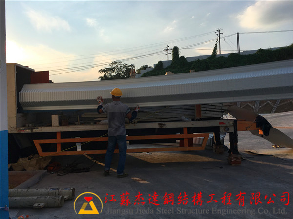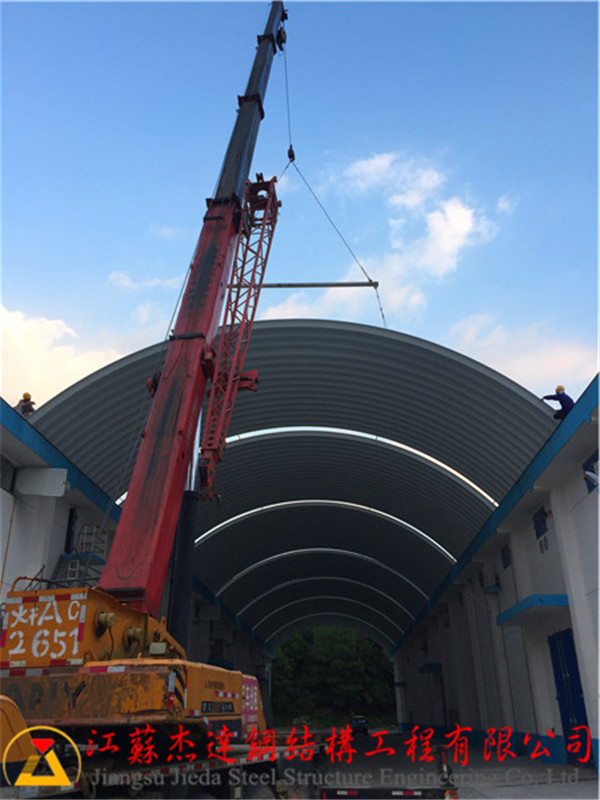 施工周期安排合理,整個工期為31個工作日。施工人員于2016年9月1日進場,9月12日完成托板焊接,隨后于9月18日進行拱形屋頂彩板的出瓦作業。10月5日完成屋頂吊裝,接著安裝采光帶,并于10月9日順利竣工。