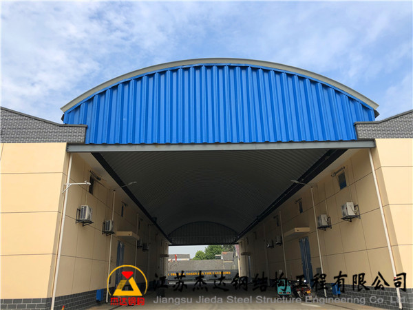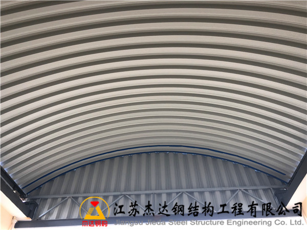 該項目位于江蘇省南京市浦口區糧食儲備庫內,罩棚跨度達16米,長度60米,采用拱形波紋鋼屋蓋結構。結構兩側設有250*250H型鋼,上方焊接托板,配合兩側桁架支撐。桁架外側覆蓋了通過壓制成型的拱形瓦片,用作山墻,增強整體穩定性與美觀度。