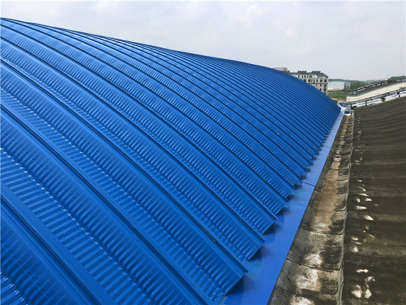 拱形屋頂采用模塊化冷彎技術進行現場成型與安裝,確保瓦片排列整齊,排水順暢。屋頂兩側均加裝泛水板包邊,同樣使用海藍色彩涂板,厚度為0.5mm,既起到防滲防漏的作用,又統一了整體外觀風格。