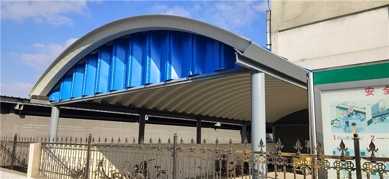 該項(xiàng)目采用的無梁拱形屋頂結(jié)構(gòu),外觀呈現(xiàn)海藍(lán)色,整體設(shè)計(jì)緊湊,功能齊備。施工中我們?cè)趦蓚?cè)安裝了山墻封閉結(jié)構(gòu),進(jìn)一步提升了整體的穩(wěn)定性和防護(hù)性能。