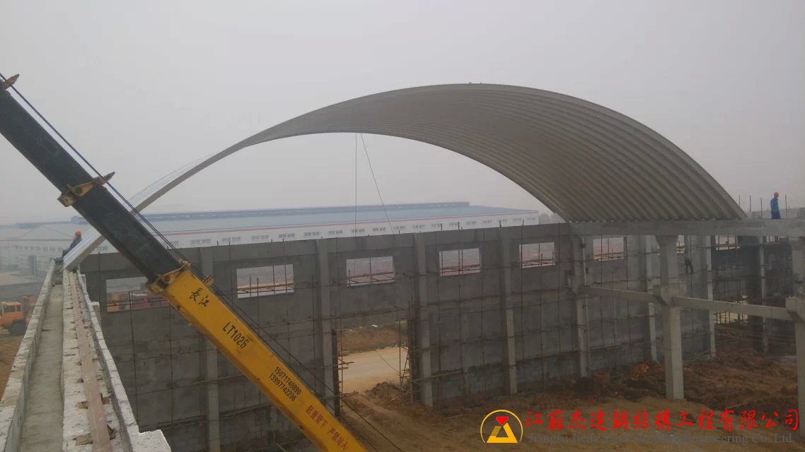 本次拱形屋頂工程施工面積達8萬多平方米,施工單位江蘇杰達鋼結構工程有限公司憑借豐富的鋼結構施工經驗,采用科學施工方案,確保項目質量和進度。施工中嚴格執行安全管理制度,加強現場監控,保障施工安全無事故。